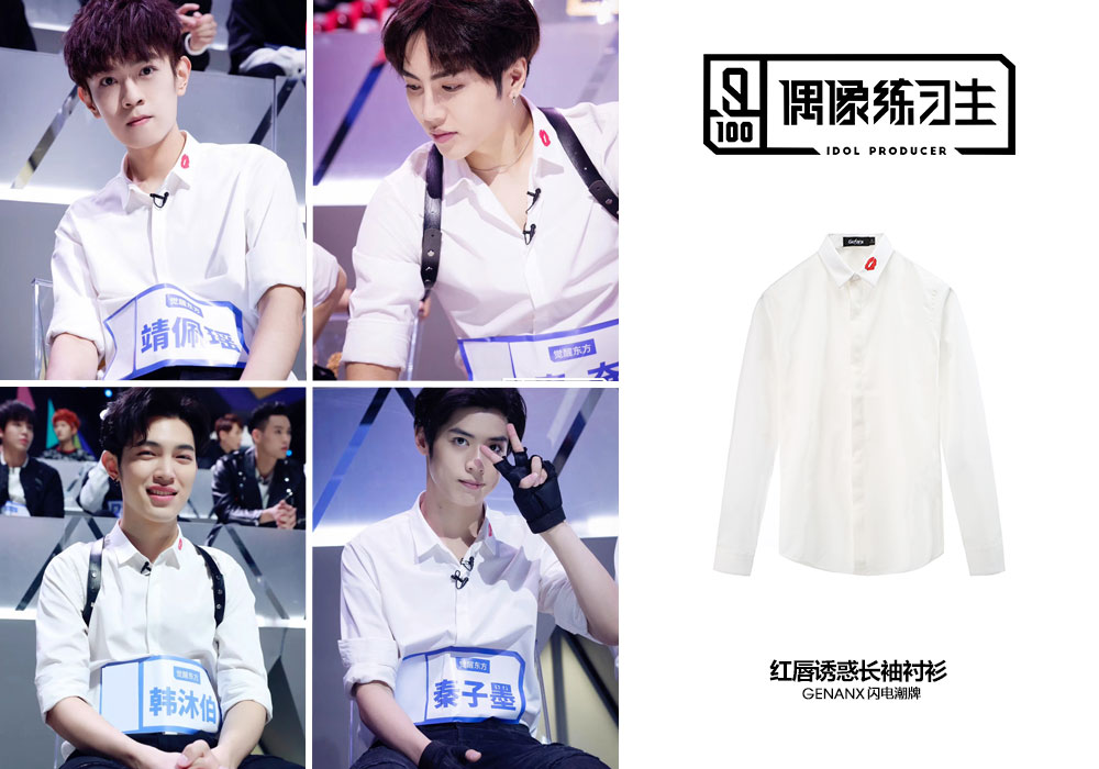 同样是《偶像练习生》参赛选手,刚以Awaken-F组合出道的秦奋,韩沐伯等觉醒东方男团五位选手全部都穿上GENANX闪电潮牌白色红唇衬衫。