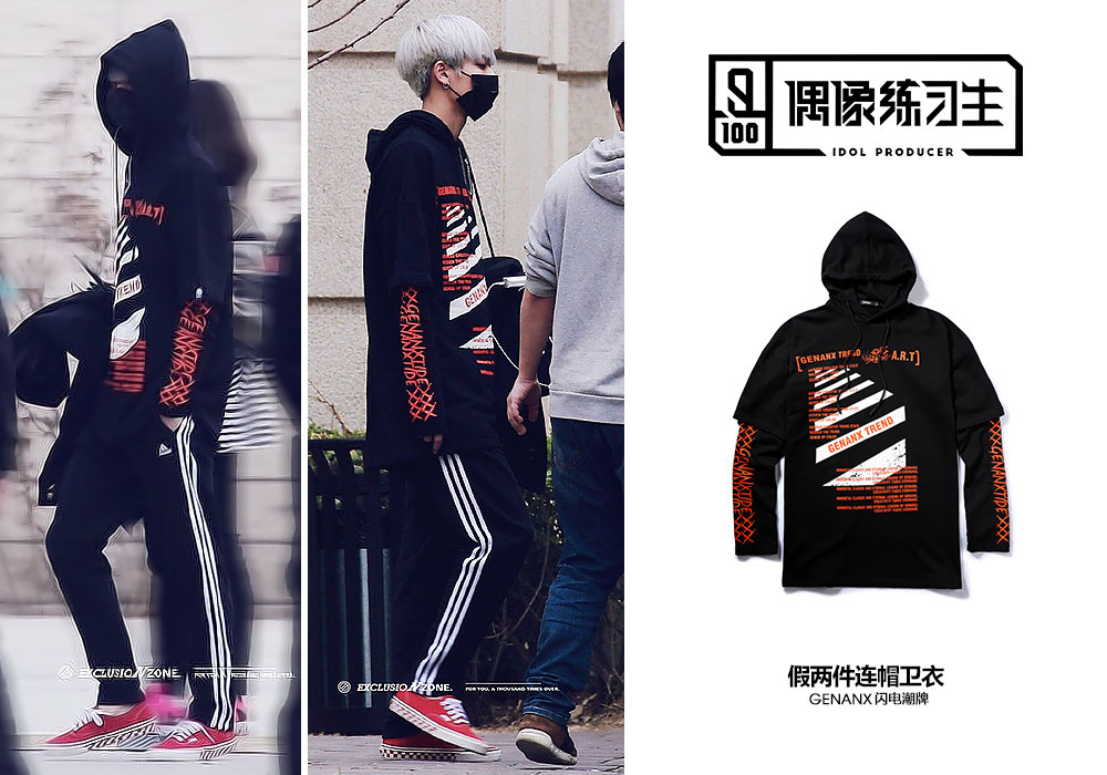 林彦俊也是香蕉九子中的一员,《偶像练习生》出道成功的NINE PERCENT成员,穿过GENANX闪电潮牌印花假两件卫衣进入大厂参与录制。
