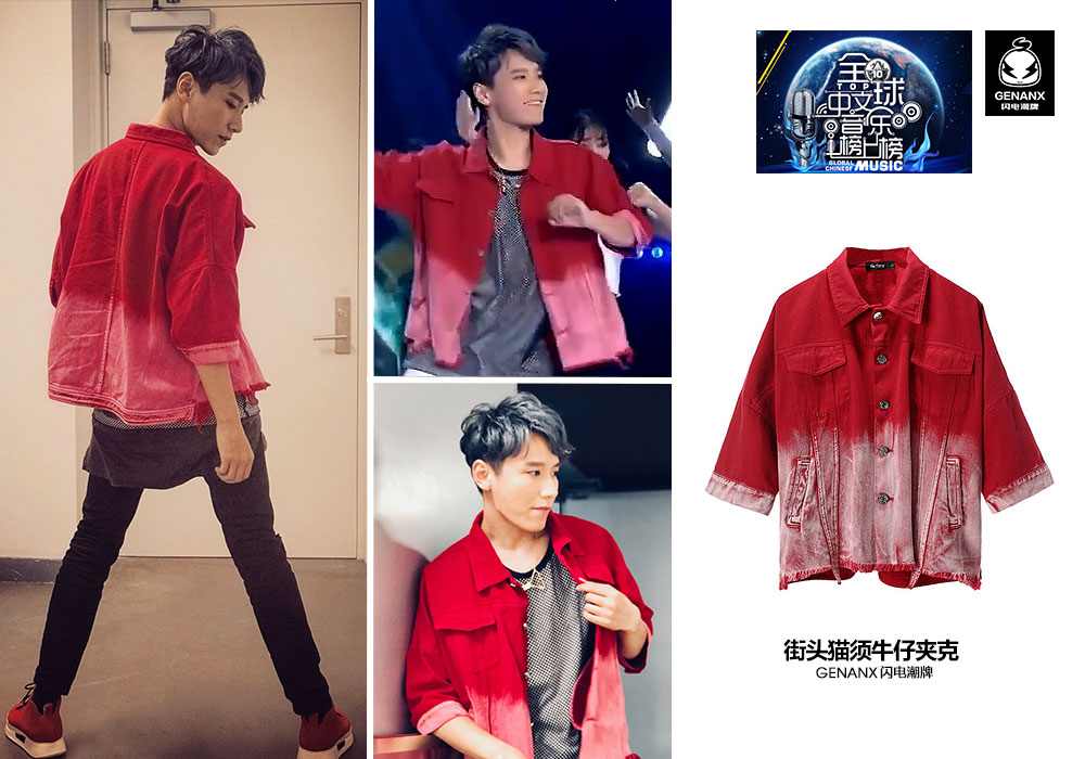 新晋小鲜肉张泽身穿GENANX闪电潮牌的红色半袖牛仔外套,登上央视《全球中文音乐榜上榜》献唱了一首《爱你在心口难开》。这明快活泼的曲风搭配上耀眼的红外套,一出场就让人沸腾。